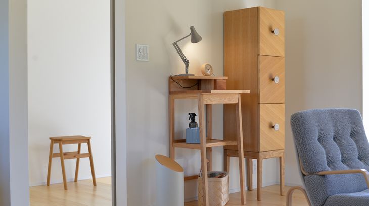 ANEMONE Tall Cabinet 展示商品仕様 サイズ W35×D42.5×H160 素材 オーク/小石原ツマミ 仕上 オイル仕上 生産地 日本 納期 6 weeks 備考 その他、バリエーションあり コーディネート事例 (モリスデザイン 様) ANEMONE Tall Cabinet SINUS LINE Pendant 172A