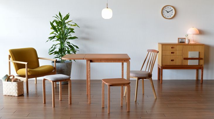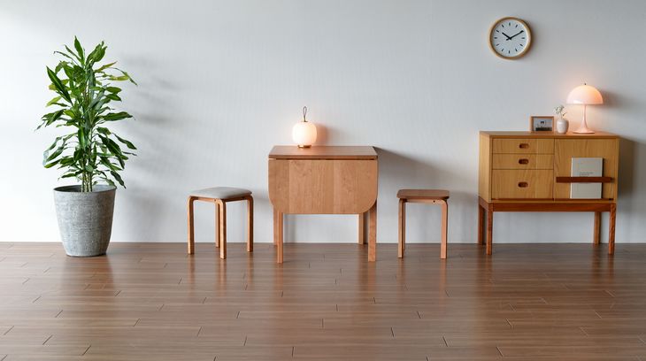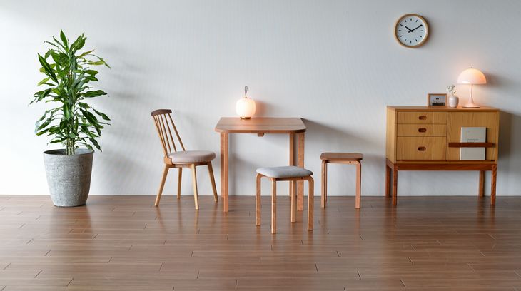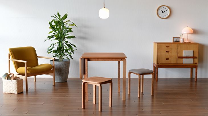 COCCO Stool 展示商品仕様 サイズ W35×D35×SH44 素材 ブラックチェリー 仕上 オイル仕上 張地 RANK4:ラムース アイボリー 生産地 日本 納期 5 weeks 備考 その他、バリエーションあり BUTTERFLY Stool COCCO Stool ❘ 板座
