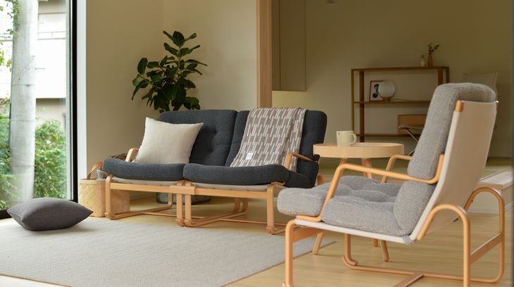 MARGARETA Sofa 展示商品仕様 サイズ W124×D75×H68×SH36 素材 ビーチ 仕上 ウレタン塗装 張地 D:D0695 生産地 日本 納期 5 weeks 備考 その他、バリエーションあり コーディネート事例 (撮影協力:モリスデザイン 様) YU UT6 Side Table CLEMATIS Side Board