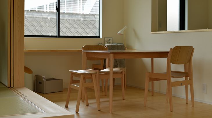 MIZUNOE Chair|板座 展示商品仕様 サイズ W45×D52×H77×SH42 素材 ナラ・ビーチ 仕上 ウレタン塗装 生産地 日本 納期 5 weeks 備考 その他、バリエーションあり コーディネート事例 (撮影協力:モリスデザイン 様) SWING Chair|ムク脚 PEG Side Table
